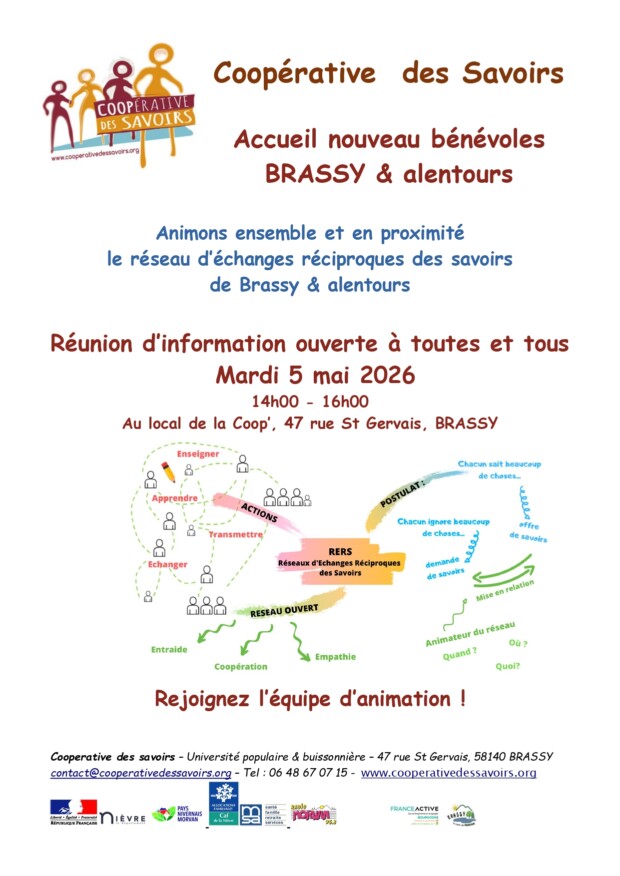 Le siège de la Coopérative des savoirs se situe depuis juillet 2021 à Brassy, où l’association dispose d’un local ouvert au public, permettant d’accueillir des évènements de diverses natures (expositions, conférences, réunions, projections, ateliers, …). Ses activités s’essaiment sur tout le territoire Nivernais Morvan.