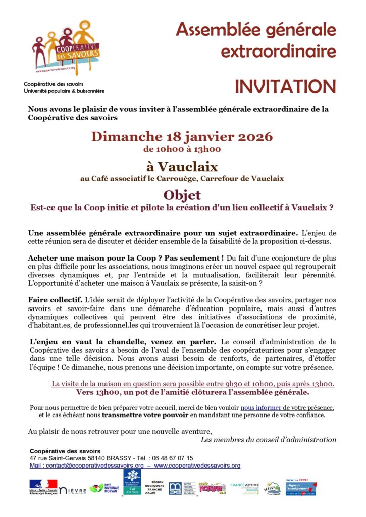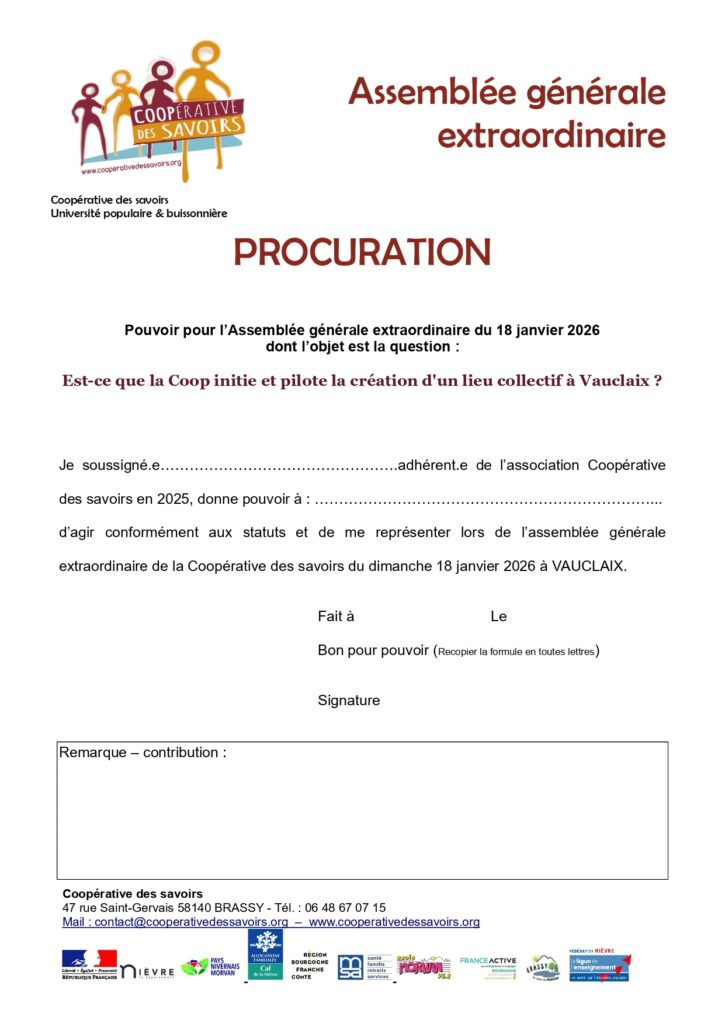 Si vous ne pouvez pas venir, pensez à donner mandat à quelqu’un de votre confiance (formulaire ci-dessous ou sur demande par mail : contact@cooperativedessavoirs.org)