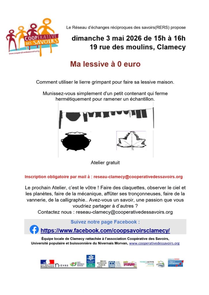 Atelier fabrication de lessive Dimanche 3 mai – 15h00 à 16h00 CLAMECY, 19 rue des moulins Sur inscription Article précédentSoirée exceptionnelle - Kanaky, une histoire colonialeArticle suivant Rejoignez l'équipe d'animation locale BRASSY
